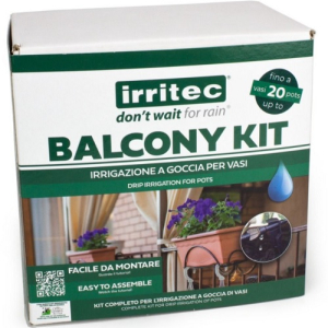 Il kit irrigazione completo Balcony è studiato per essere integrato nel proprio impianto domestico e permette l'irrigazione fino a 20 vasi o balconiere direttamente nel terriccio grazie ai gocciolatori con astina inclusa. Rende accessibile alla portata di tutti la più alta tecnologia utilizzata nella microirrigazione. Il kit è facile da montare e non necessita di attrezzi professionali. Il kit Balcony è sviluppato da Irritec, leader mondiale nell'irrigazione professionale e residenziale, ed unisce prodotti di qualità professionale ad una elevata sempicità di installazione. All'interno del kit sono presenti tutti i tubi, i raccordi e le valvole necessarie alla creazione di un impianto di irrigazione a goccia di stampo professionale. Il seguente prodotto è un kit per l'irrigazione a goccia "Pronto all'uso" che permette una distribuzione uniforme dell'acqua e dei nutrienti vicino alle radici delle painte. Inoltre rende disponibile la più alta tecnologia disponibile nella microirrigazione ad un costo accessibile per tutti. Componenti del kit