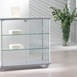 Banco/Vetrina 93/B - dimensioni 93x39x92H- con 2 ripiani regolabili in altezza, ante con serratura, con ruote piroiettanti. |