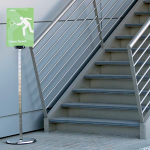 Struttura autoportante per pannelli segnaletici, per interno ed esterno. Questi possono avere uno spessore massimo di 6 mm e si serrano a “pinza” su una superficie di 12x125 mm. Sostituendo la vite di serraggio è possibile ospitare pannelli di spessore maggiore.