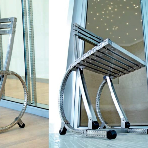 Sedia “elastica”, dal design particolare. Le gambe calandrate conferiscono alla seduta un confortevole effetto molleggiato.Disponibile in acciaio inox o con seduta e schienale in listelli in legno
