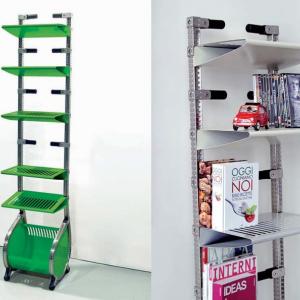 Struttura a mensole per il posizionamento di libri e CD/DVD. Le 5 mensole colorate possono accogliere fino a 15 supporti multimediali ognuna; sono smontabili e riposizionabili. Il collocamento dei libri è previsto con dorso laterale permettendo un’esposizione particolare ed efficiente. Il contenitore alla base di forma circolare può essere ruotato ridefinendo un design sempre nuovo.