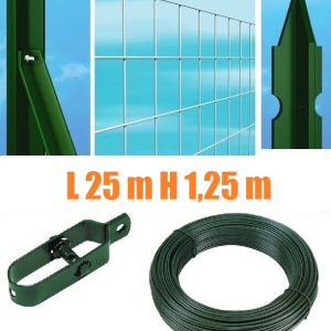 (N° 1 PZ) COD 2223 - 25mt- ROTOLO RETE METALLICA ZINCATA ELETTROSALDATA- MAGLIA: mm50x75 - H 125 cm ------ Rete in filo zincato elettrosaldata-Made in Italy- con maglie rettangolari 50X75mm- Filo Standard diametro: 1,80 mm(GARANTITO 100%) L'impiego è rivolto principalmente ai settori edili, industriali, agricolo e zootecnico. La sua caratteristica principale è il fatto che si presenta come rete economica in quanto la zincatura è esclusivamente sul filo e l'elettrosaldatura viene effettuata dopo la zincatura. (N° 10 PZ) Cod. 2180 PALETTO RECINZIONI A "T" IN FERRO PLASTIFICATO VERDE - ALTEZZA 150 cm - PER SOSTEGNO DI RETI METALLICHE----Palo in ferro avente sezione a "T" mm 30x30x3 - plastificato colore verde completo di foratura per passaggio fili di tensione e punta superiore. Adatto per il posizionamento di recinzione sia su terreno che su muretto. Trattamento di base del palo: Sabbiatura, degrassaggio, lavaggio, asciugatura, plastificazione, polimerizzazione a 200° Peso Kg 1,88 (N° 2 PZ) Cod. 2190 SAETTA A "L" IN FERRO PLASTIFICATO VERDE - ALTEZZA 120 cm - PER SOSTEGNO PALETTI RECINZIONE----Saette in Angolare in ferro avente sezione a "L" mm 25x25x3 - plastificate con foratura per fissaggio al palo. Articolo indispensabile per poter mettere in tensione la rete e i fili in quanto evita la flessione sul primo palo e sugli angoli. Va imbullonata diagonalmete al palo tramite bullone 8x30 mm. La saetta va cementata o tassellata al terreno/murettoIl tutto per una posa in opera a regola d'arte. Trattamento di base del palo: Sabbiatura, degrassaggio, lavaggio, asciugatura, plastificazione, polimerizzazione a 200°. Peso : Kg 1,20 (N° 1 PZ) Cod. 2196 FILO DI LEGATURA ZINCATO - DIAMETRO 1,5mm - PER RECINZIONI IN RETE METALLICA - MATASSA DA 100 mt---filo estremamente malleabile adatto alle legature della recinzione per una posa in opera perfetta. Il filo di legatura può avere molteplici utilizzi in più campi d'impiego. (N° 1 PZ) Cod. 2199 FILO DI TENSIONE ZINCATO - DIAMETRO 2,2mm - PER RECINZIONI IN RETE METALLICA - MATASSA DA 100 mt----Si tratta di un filo rigido ed acciaioso adatto al tensionamento orizzontale con lo scopo di sorreggere ed irrobustire la recinzione per una posa in opera a regola d'arte. (N° 6 PZ) Cod. 2200 TENDIFILO ZINCATO PER RECINZIONI IN RETE METALLICA---- Tenditore/tendifilo a cricchetto per filo da tensione. Si utilizza fissado un capo del filo nel foro esistente e l'altro capo viene inserito nel perno che ruotando mette in trazione il filo senza possibilità di ritorno. Il filo di tensione se non è tirato adeguatamente non ha senso di esistere ed è di fondamentale importanza per una buona riuscita della posa in opera. |