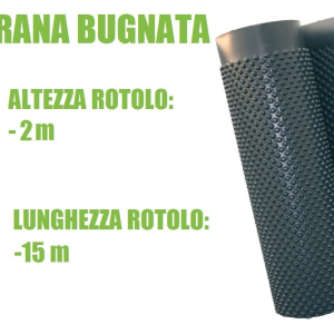 La membrana bugnata impermeabilizzante è ideale per proteggere le fondazioni ed i muri interrati, realizzato in HDPE, viene posato sulla superficie delle murature e consente una totale separazione tra i muri, sia di calcestruzzo che in muratura, e l’umidità del terreno, grazie alla presenza di oltre 1850 bugne al mq, che tenendo staccata la membrana di circa 7,5 mm, formano un volume d’aria pari a 5,3 l/mq. La separazione tra il terreno di scavo e getto di platea, garantisce l’impermeabilizzazione delle fondazioni che risultano protette.Nelle costruzioni sotterranee e nelle opere di ingegneria civile la membrana bugnata consente un sicuro drenaggio ed un convogliamento dell’acqua lontano dalle costruzioni preservando la struttura dell’edificio. La membrana bugnata è di facile posa in opera: basta srotolare il rotolo di membrana mantenendo le bugne aderenti alla parete e fissarlo con appositi chiodi e/o tasselli al supporto da proteggere.