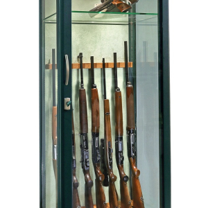 La vetrina è allestita con rastrelliera portafucili in legno, pannello posteriore in tessuto verde acqua, piano in cristallo spostabile su cremagliera ed illuminazione con 2 faretti LED. VerniciaturaLa verniciatura nel colore Verde Marmo (ral 6012), in finitura bucciata, e realizzata a forno, con polveri epossipoliestere, previa sgrassatura e fosfatizzazione a caldo in tunnel, ed essiccata in galleria termica ad una temperatura di 200° C.