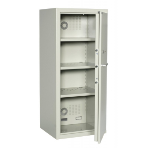 Possibilità di inserimento di piani supplementari ( 69,4x49x8xh3,1 ) a richiesta con aggiunta di € 26,95 + iva cadauno CARATTERISTICHE TECNICHE Gli armadi di sicurezza monoblocco vengono realizzati in lamiera di acciaio speciale di 1a scelta S235JR, dello spessore di 2 mm. Gli sportelli sono scatolati con cerniere interne e bordo antistrappo apribili a 180°. Hanno un sistema di chiusura con cremagliera a 3 espansioni comandate da maniglia che aziona 3 catenacci orizzontali e 2 verticali di diam. 22. Riferma con serratura di sicurezza a doppia mappa. Il sistema può essere integrato da ritardatore di apertura. Sulla parete posteriore ci sono fori per passaggio cavi, persianine di aerazione pae la circolazione naturale dell'aria e predisposizione per 2 elettroventole diam. mm. 120. Allestimento interno All'interno ci sono 3 piani spostabili e su richiesta del cliente cremagliere per rack 19" fisse-20/35 unità Verniciatura La verniciatura nel colore Griglo (ral 7032) in finitura bucciata è realizzata a forno, con polveri epossipoliestere, previa sgrassatura e fosfatizzazione a caldo in tunnel, ed essiccata in galleria termica ad una temperatura di 200° C. OPTIONAL: RITARDATORE DI APERTURA