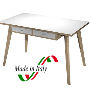 Piano scrivania in spessore 22 mm . Materiale in melaminico antigraffio ed antiriflesso con bordo in spessore arrotondato, con assenza di spigoli vivi. Gambe inclinate in legno massello (K143) o metallo (K67) bianche o nere.